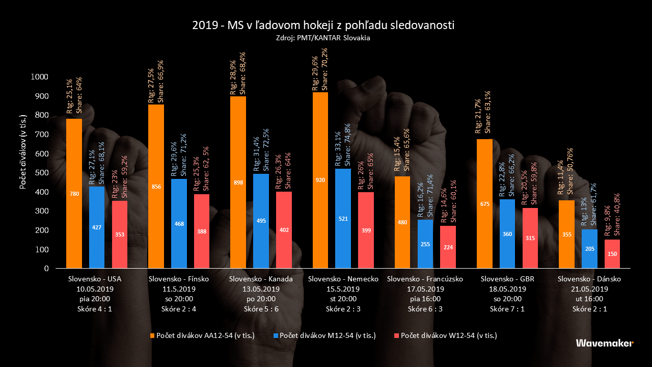 V tomto roku sa sledovanosť zápasov menila z pohľadu dôležitosti. Prvé štyri zápasy sa pohybovali na úrovni 780-920-tisíc divákov vo veku 12-54. Najsledovanejším zápasom slovenského tímu bol zápas Slovensko-Nemecko zo dňa 15. 5. 2019, ktorý sledovalo 920-tisíc ľudí vo veku 12-54, vďaka čomu dosiahol rating 29,6% a share 70,2%. U mužov 12-54 to bol rating 33,1% a share až 74,8%.