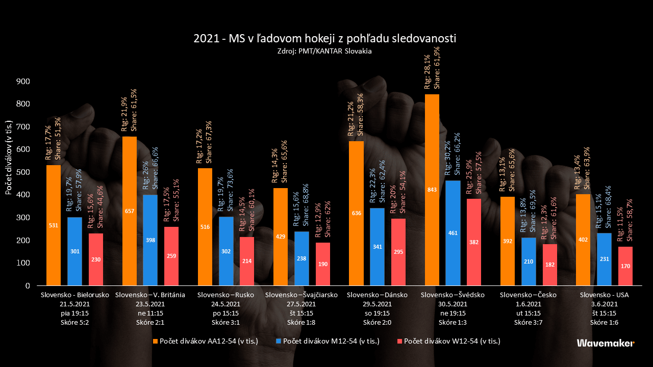 Pri pohľade na dáta môžeme skonštatovať, že absencia športového turnaja sa vôbec nepremietla do sledovanosti a čísla prvého zápasu slovenského tímu skončili v porovnaní s minulými rokmi nižšie. Kým v predchádzajúcich rokoch sledovalo prvý zápas 597-780-tisíc ľudí 12-54, tak v roku 2021 sledovalo prvý zápas „len“ 531-tisíc ľudí rovnakého veku. Duel s Bieloruskom dosiahol rating 17,7% a share bol 51,3%.